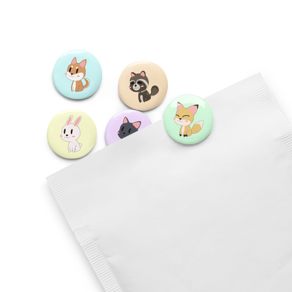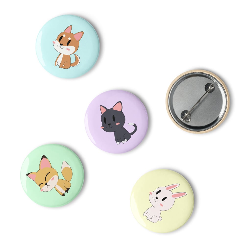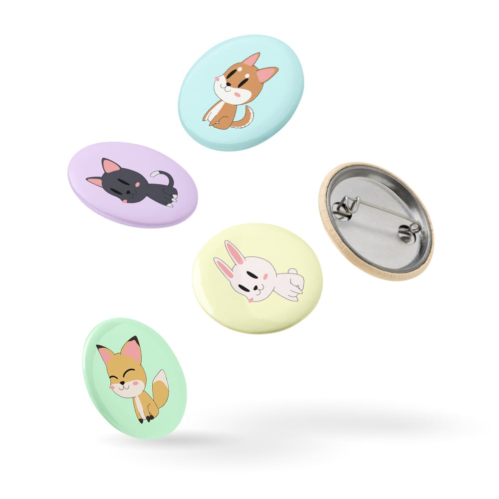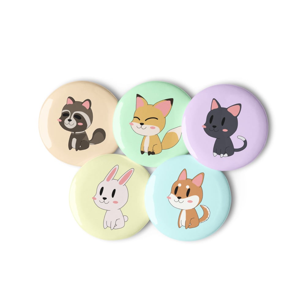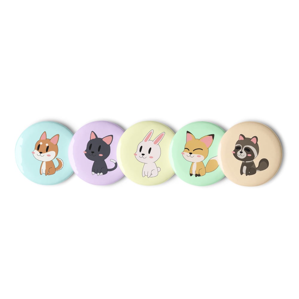 Dog, Cat, Bunny, Fox & Tanuki Set of pin buttons 1.25″ 犬 猫 兎 狐 狸 デフォルメ 缶バッジ
